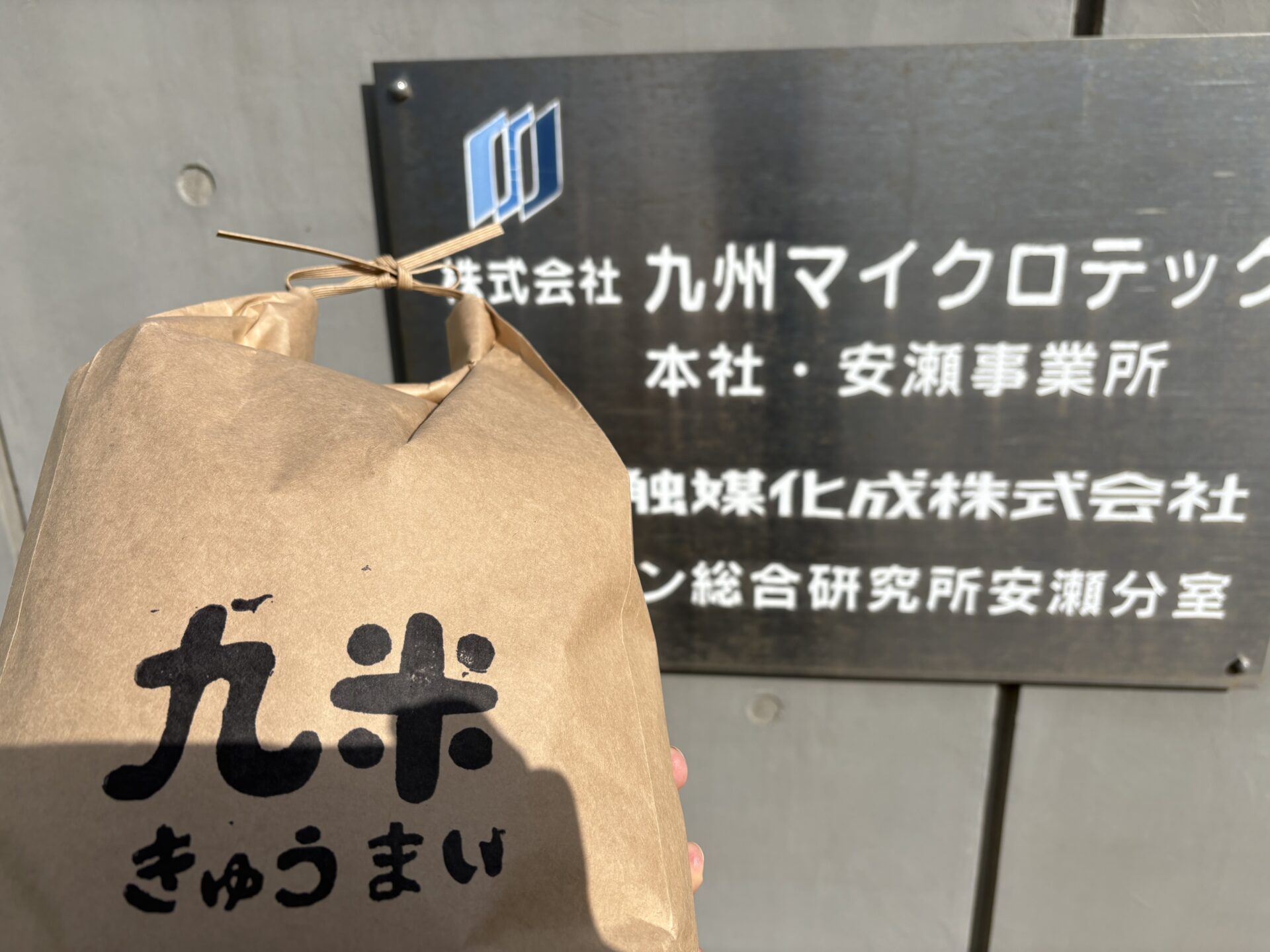 説明を伺うと、九州マイクロテックの皆様(社長含む)で田植え体験を実施し、そのお米を収穫し、会社から従業員の皆様へ提供されているとのこと。このお米が高い時代に、嬉しいお心遣い。