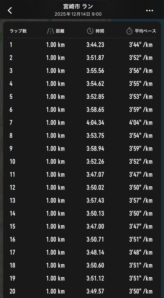 宮崎神宮の折り返しから、ペースが3分50秒ではまる。
